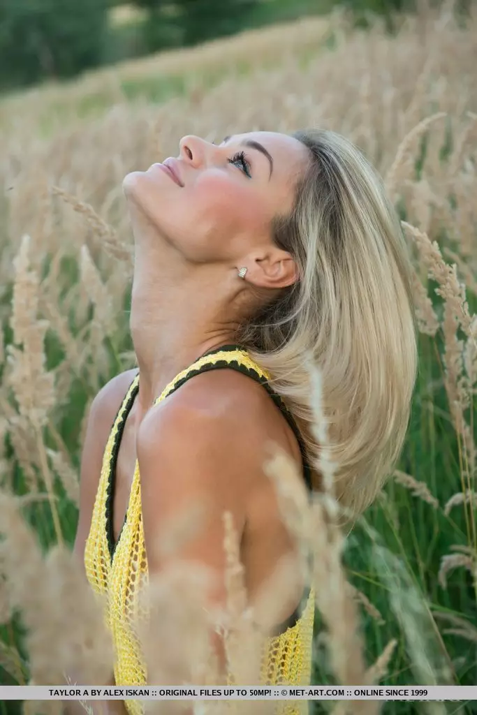 Возбуждающая блондинка Taylor A хочет показать свою волосатую киску на лугу — Taylor A