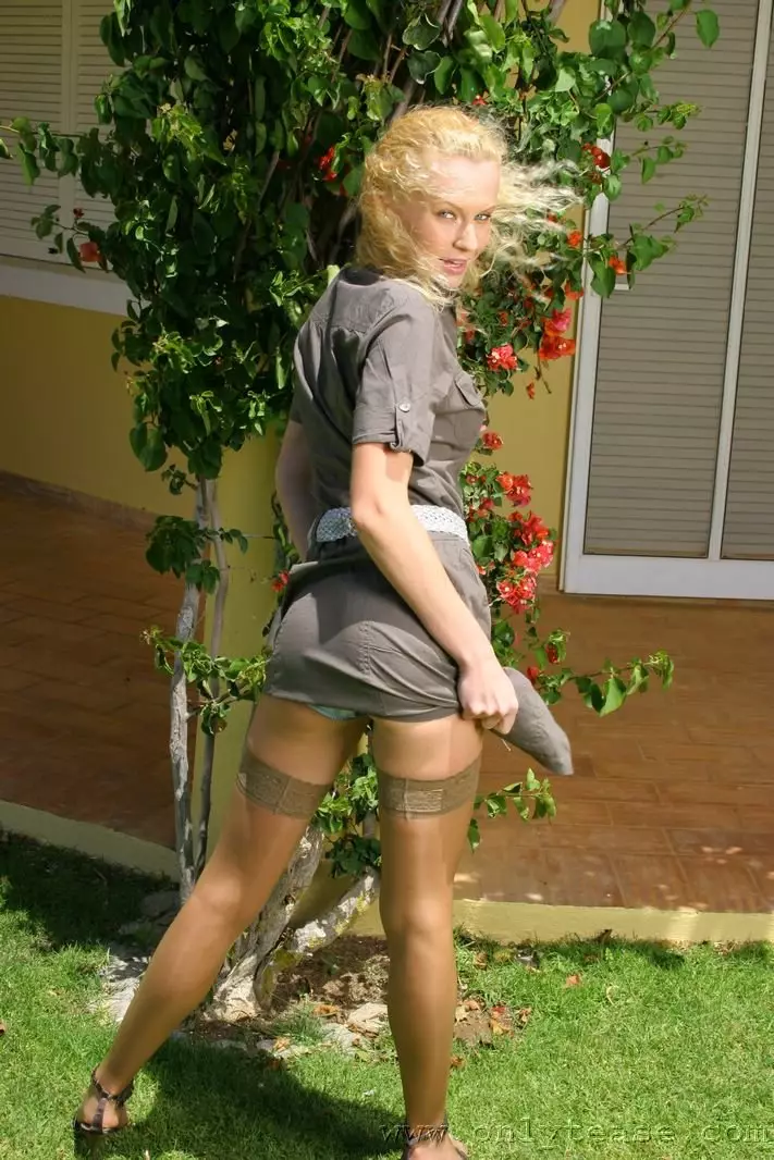 Блондинка Tiffany Ryan расстегивает серое мини-платье и снимает свое голубое белье на заднем дворе — Tiffany Ryan