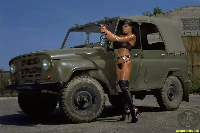 Детка с оружием, в черной бандане и сапогах Veronica Vanoza показывает свои большие сиськи в масле — Veronica Vanoza
